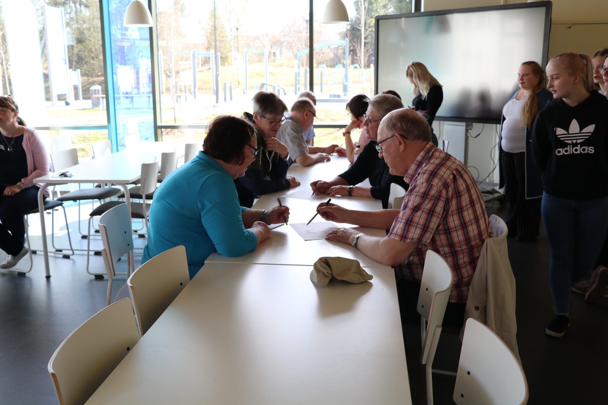 Maanantai-iltapäivällä aurinko paistoi täydeltä terältä S-rakennuksen puistikko-osaan. Aurinko näkyi myös sisätiloissa ihmisten kasvoilla iloisina ilmeinä, kun Sosiaali- ja terveysalan keväällä valmistuva, aisti- ja taide-elämykset lähihoitajan työssä -valinnaista suorittava, lähihoitajaryhmä piti Tavastian Seniorikillalle elämyspäivää. Seniorikillan puheenjohtaja Ossi Lapisto kiitteli tapahtuman alussa sitä, että tällainen päivä oli onnistuttu yhteistyössä järjestämään. Hän myös toivoi, että tällaisia opiskelijoiden opintopoluilla etenemistä palvelevia tilaisuuksia voitaisiin järjestää myös myöhemminkin. Keskeisin viesti oli kuitenkin, että ”Nyt nautitaan”.