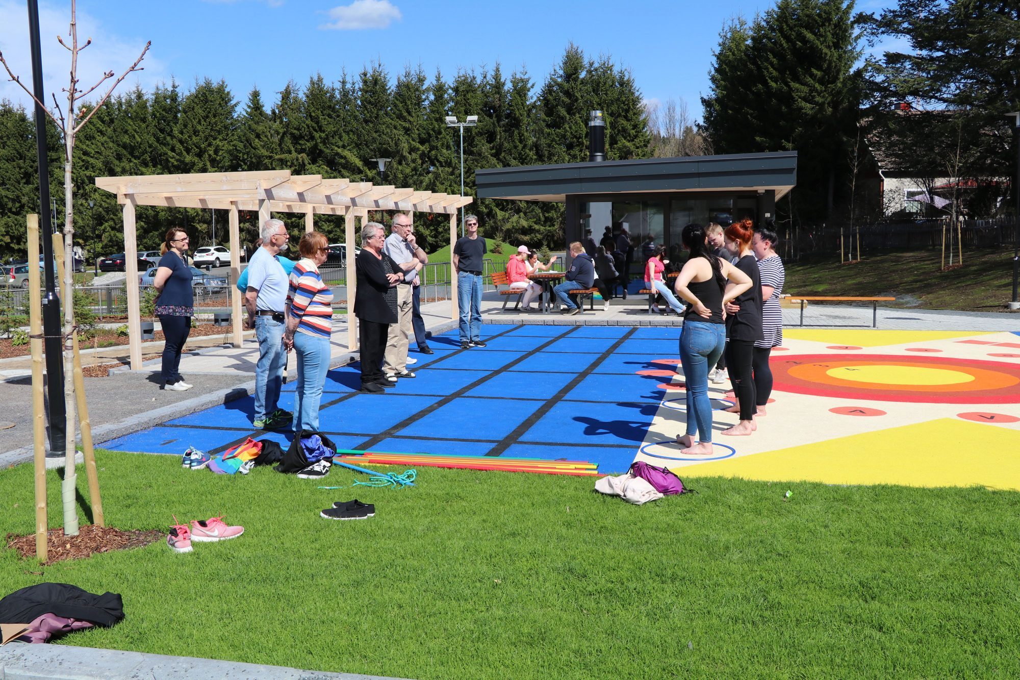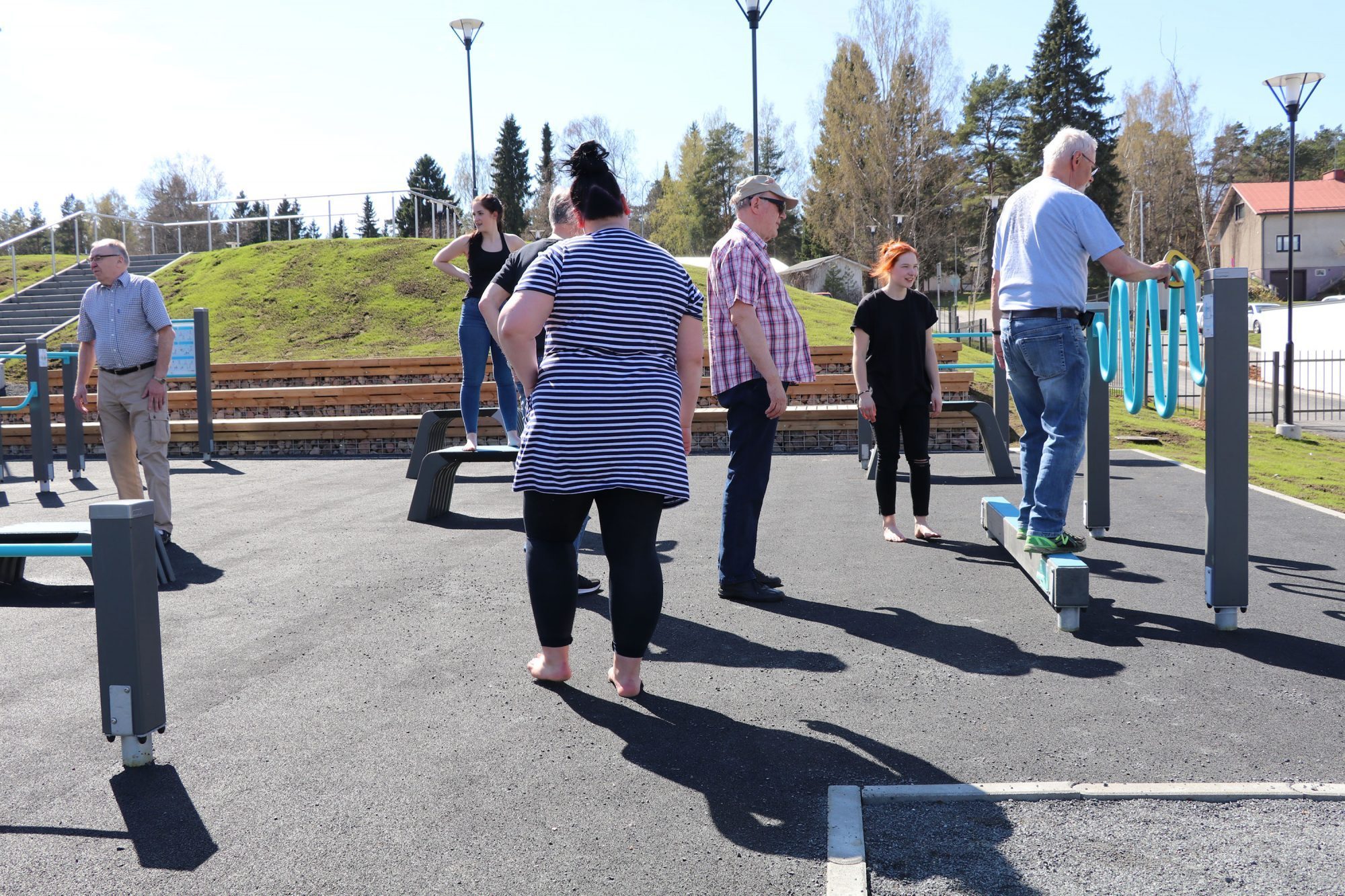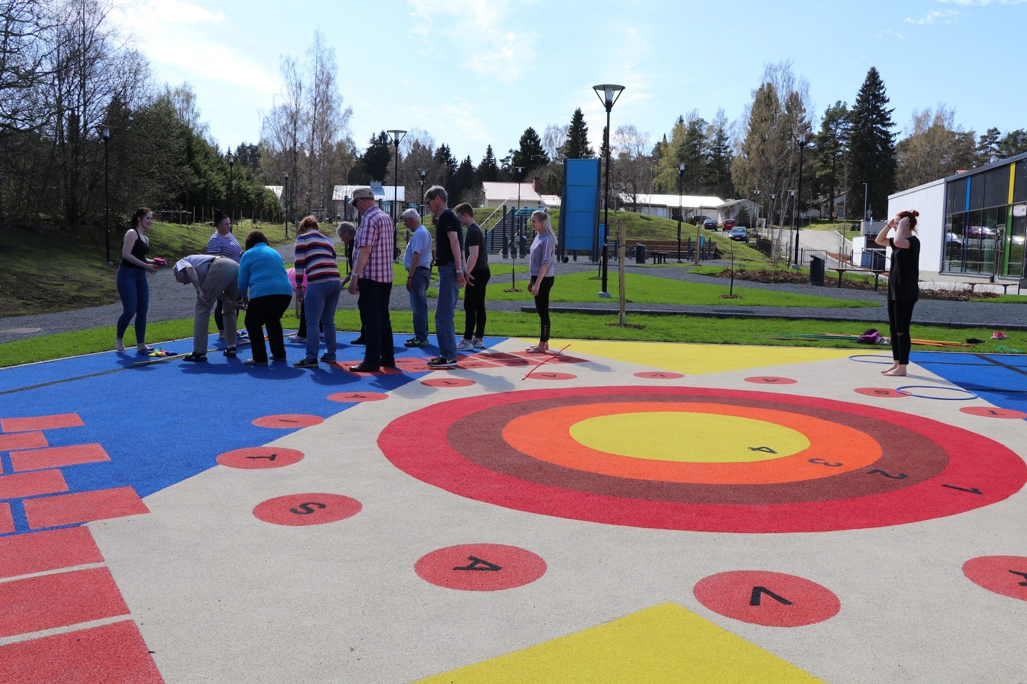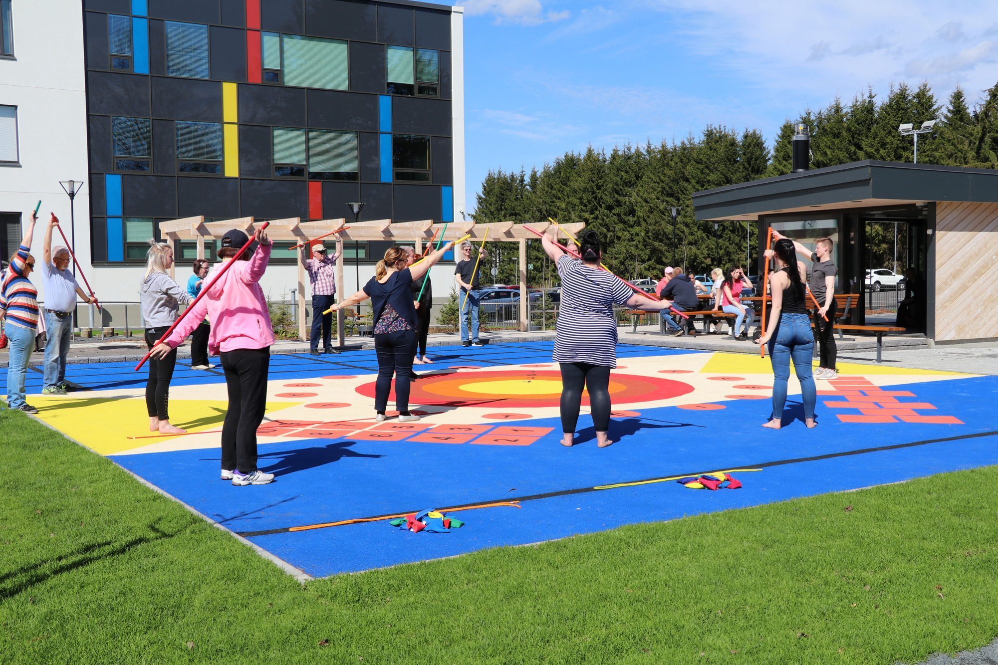 Ravitsemuspisteen jälkeen siirryttiin S-rakennuksen värikkäälle piha-alueelle liikuntapisteeseen, jossa oman kunnon mukaan osallistuttiin keppijumppaan/-venyttelyyn ja leikkimieliseen hernepussiviestiin. Liikunnasta ja sen tärkeydestä oli myös tietoiskut. Muutamat opiskelija huikkasivat, että ”liikunta on lääke kaikkeen.”