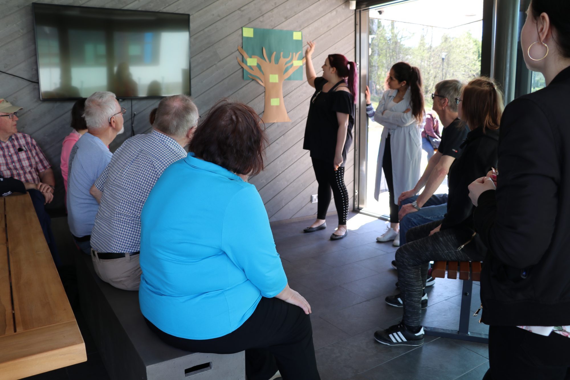Liikuntapisteestä siirryttiin porottavan auringon alta piha-alueen paviljonkiin, jossa ensiksi pohdittiin seinälle liimatun voimavarapuun avulla asioita, jotka tuovat itselle iloa. Tämän jälkeen vielä muisteltiin hyvässä hengessä korttien avulla elämän isoja ja pieniä asioita.