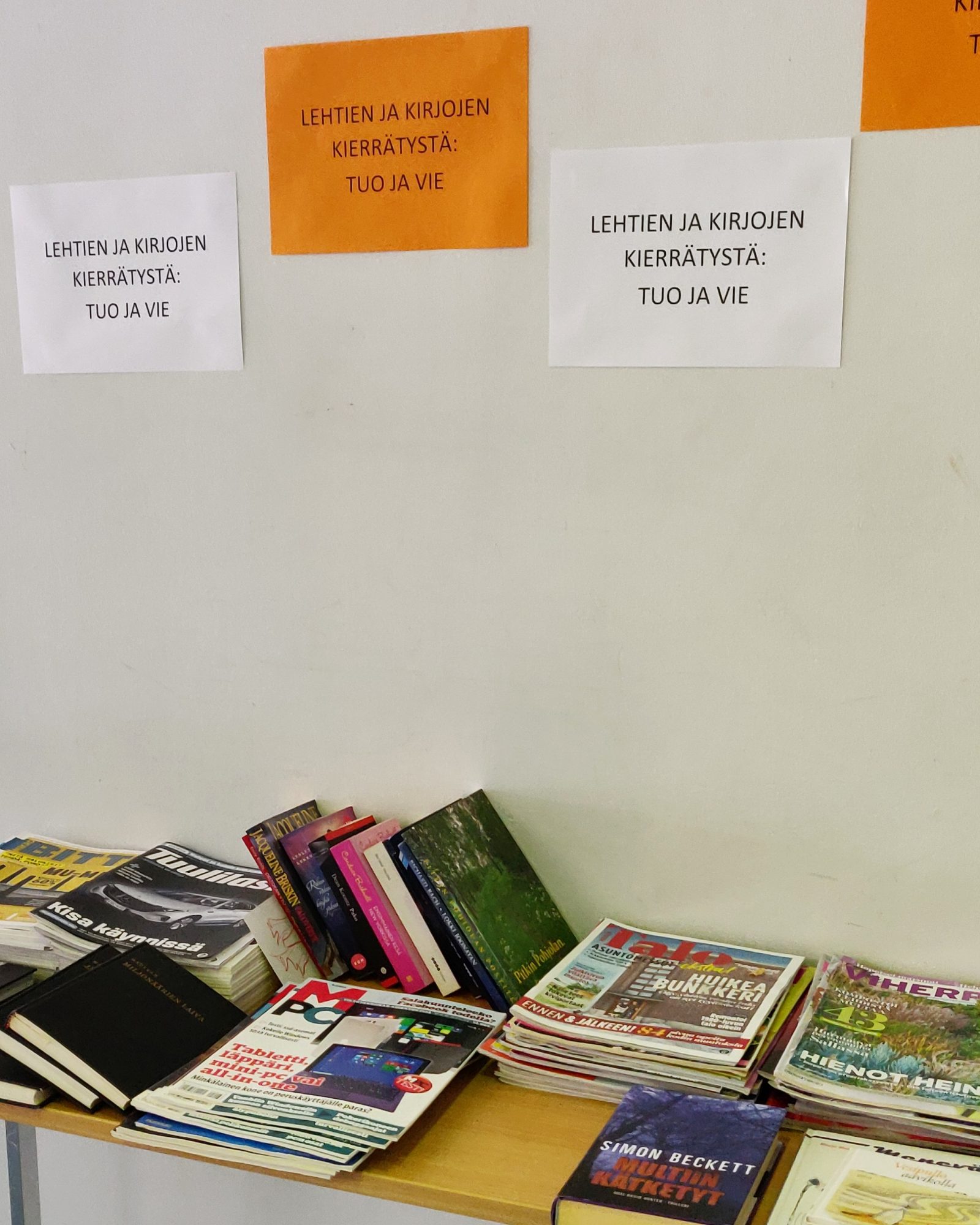 Kierrätystä on harrastettu tällä viikolla ainakin Ammattiopisto Tavastian A-rakennuksen aulassa, jossa on pöytä vanhoille kirjoille ja lehdille. Pöydälle voi tuoda itselle tarpeettomia kirjoja ja lehtiä muiden iloksi ja vastaavasti napata mukaan uutta lukemista.
