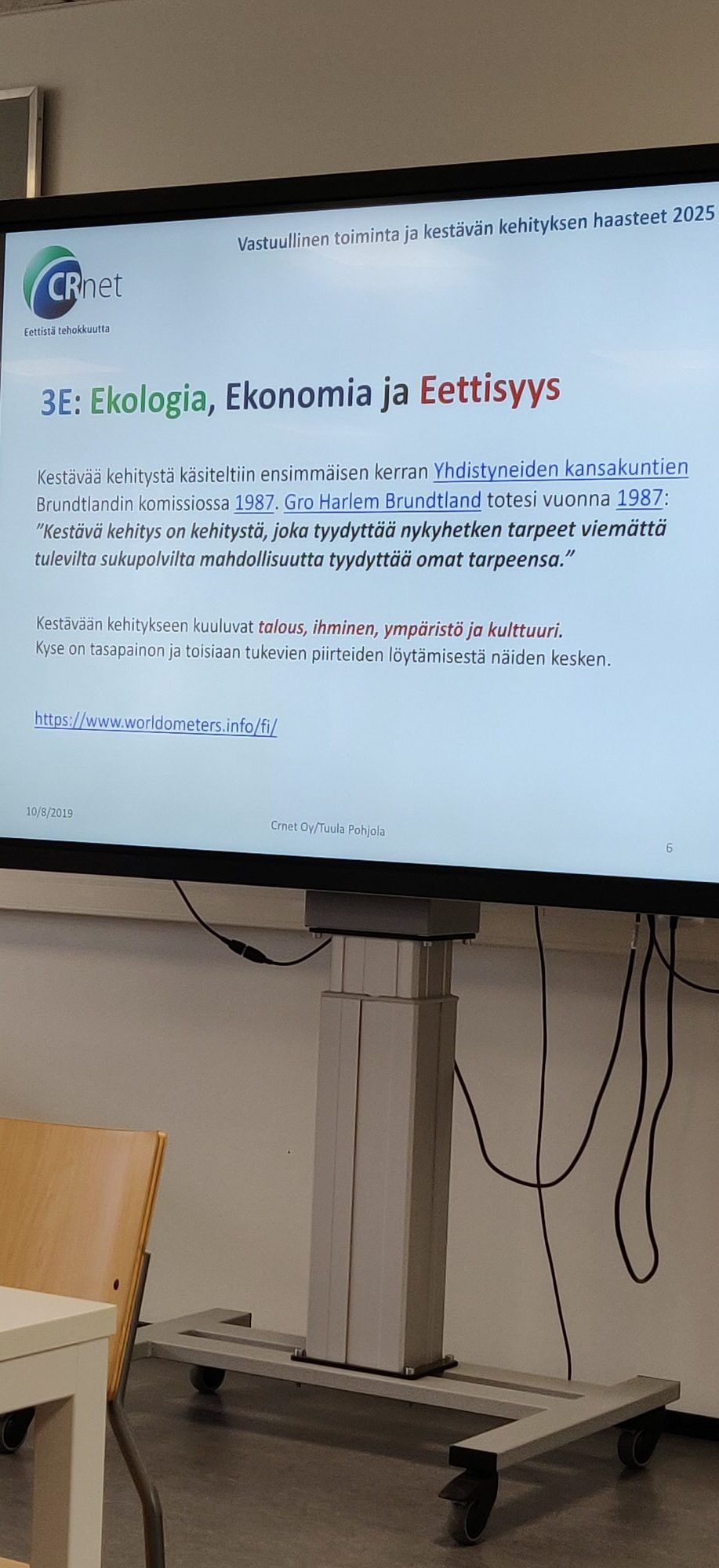 Tuula Pohjola on väitellyt tohtoriksi vuonna 1999 aiheenaan hiilijalanjälki ja sen laskeminen. Väitöskirja sisältää 305 kaavaa hiilijalanjäljen laskemiseen. Pohjola käsitteli luennossaan kestävää kehitystä laajasti. Kestävään kehitykseen kuuluvat talous, ihminen, ympäristö ja kulttuuri, ja kestävässä kehityksessä kyse on näiden kaikkien tasapainosta ja toisiaan tukevien piirteiden löytämisestä. Pohjola kuitenkin totesi lopulta kaiken tiivistyvät kolmeen E:hen: ekologia, ekonomia ja eettisyys. Ja nimenomaan tässä järjestyksessä, sillä jos ekologia ei ole kunnossa, niin kaikki muukin romahtaa.