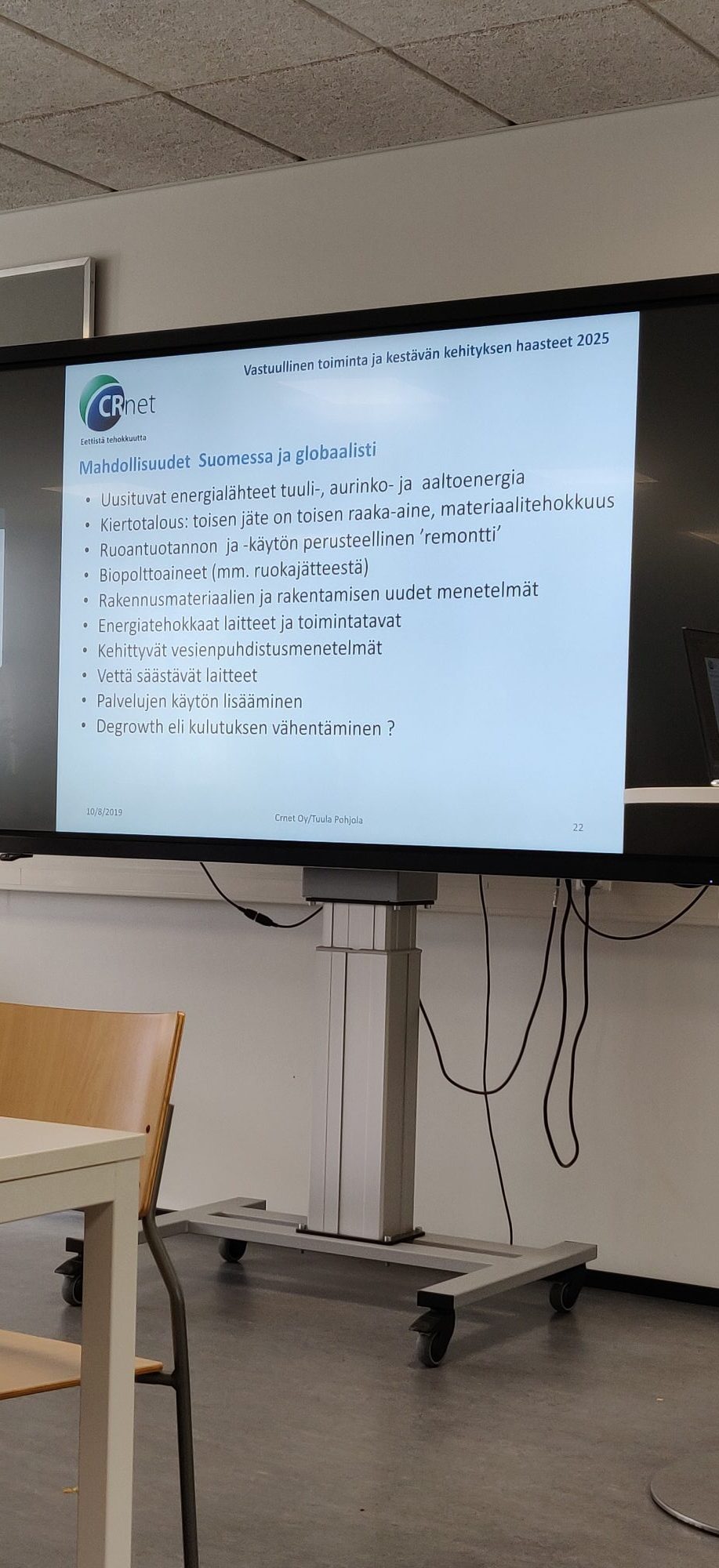 Tiistaina Hattelmalantien kampuksella henkilöstölle luennoi tekniikan tohtori Tuula Pohjola, nainen CRnet-tietokannan takana. CRnet on vastuullisen liiketoiminnan ja kestävän kehityksen tietopankki, joka sopii erinomaisesti opettajan työkaluksi. CRnetiin pääsee Tavastian verkosta selaimen etusivun Opetuslinkkejä-linkin takaa. CRnet julkaisee säännöllisesti vastuullisen toiminnan uutiskirjettä ja palvelussa onkin kerättynä 55 000 uutista vuodesta 2006 alkaen. Tietopankilla alkaa siis olla jo tutkimuksellista merkitystä ja se helpottaa tiedonhakua merkittävästi.