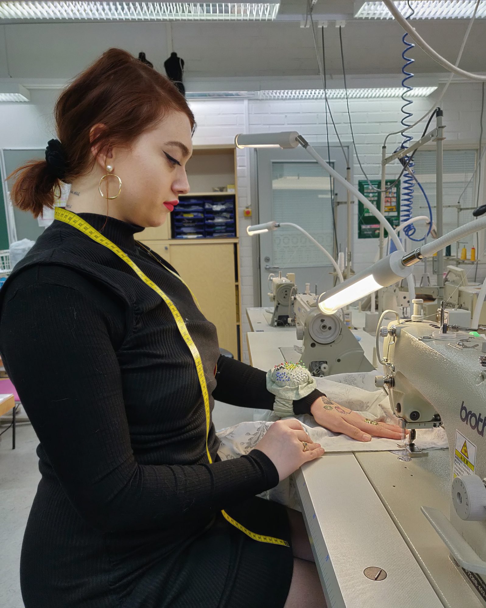 ”Koulusta saa tosi hyvät perustaidot tehdä mitä vaan ompeluun ja vaatteisiin liittyvää. Voi opiskella vielä lisää tai tehdä töitä, ja kun on yksi tutkinto taskussa, voi vaikka työskennellä ja tienata opintojen ohella!”