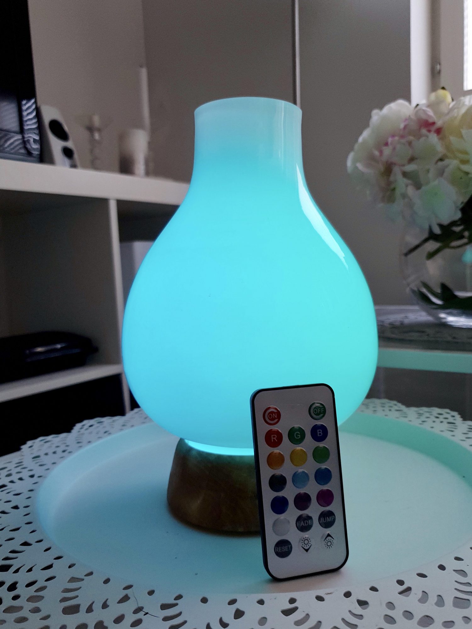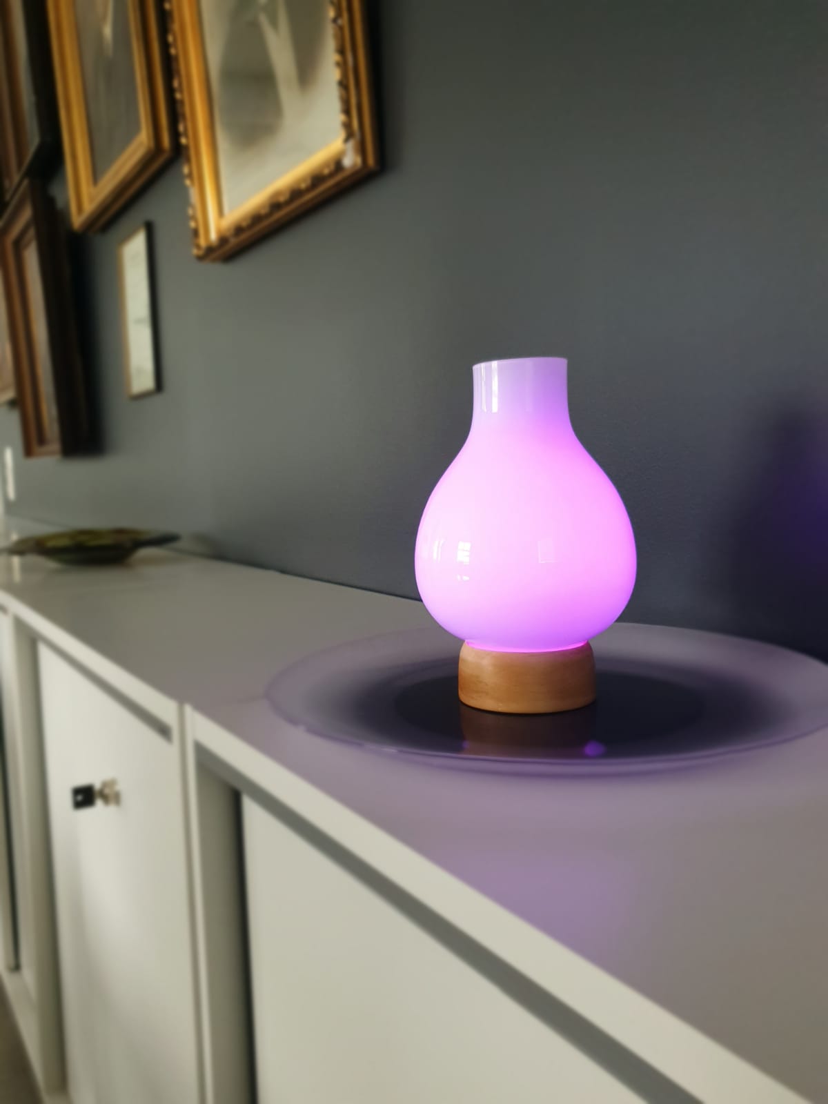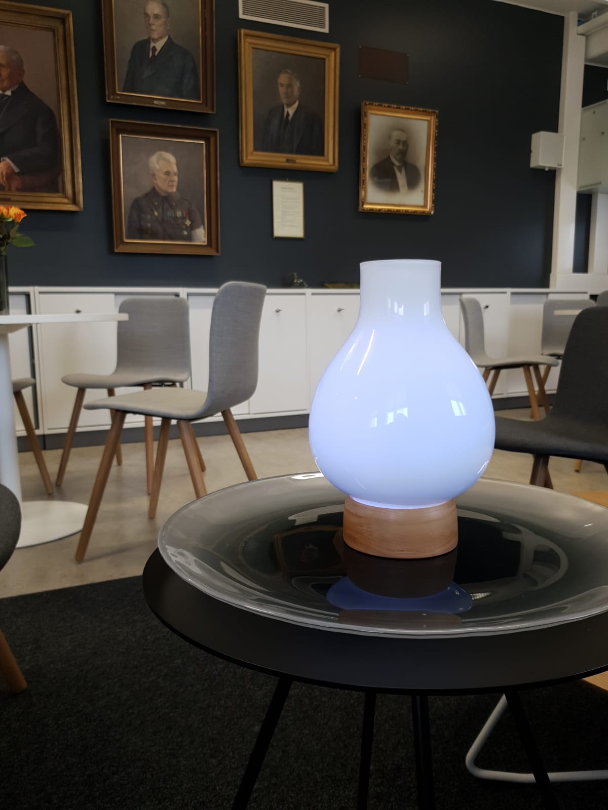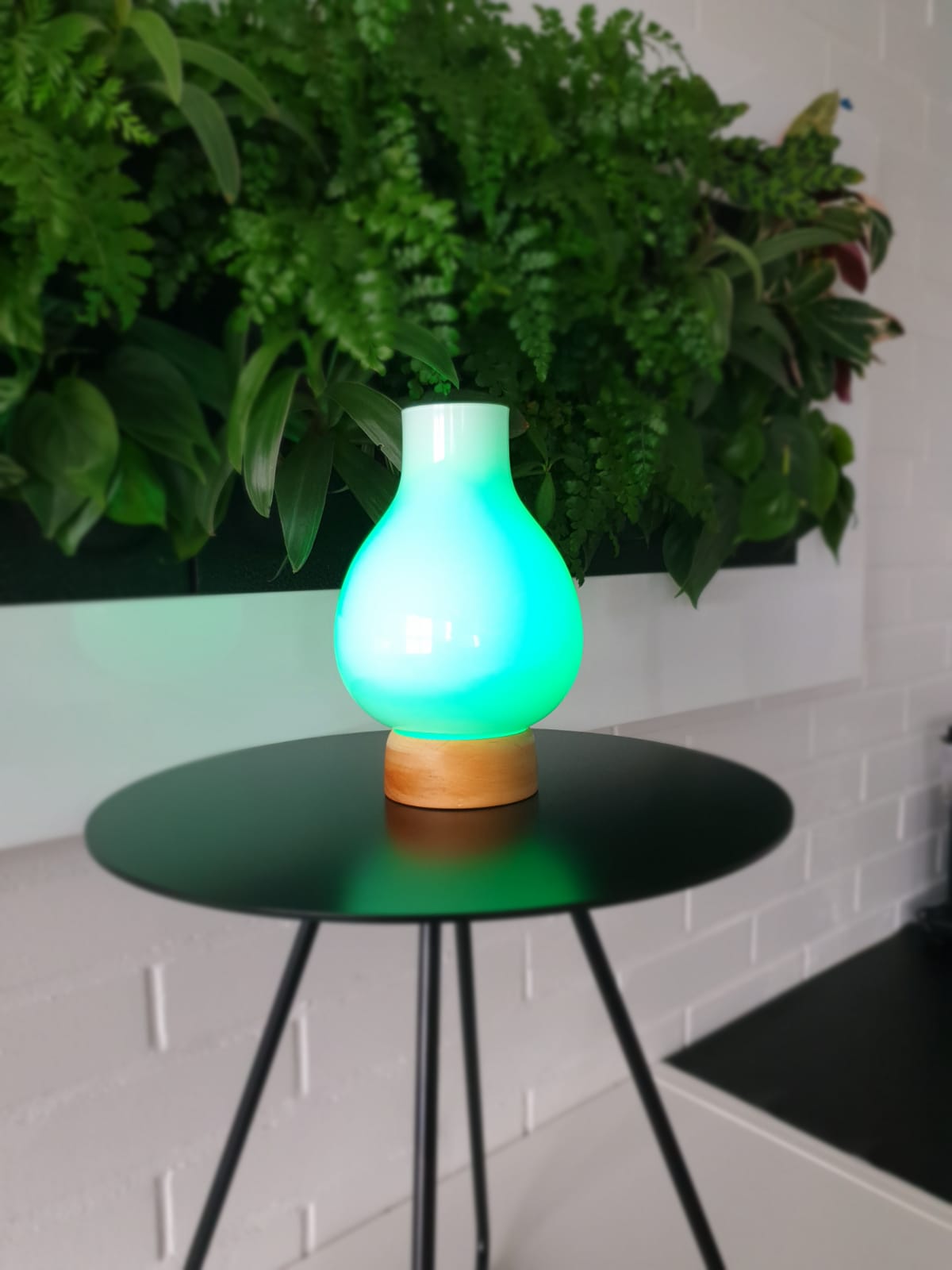Lopulta tuotteeksi valittiin kuin valittiinkin valaisin, mutta käsityönä tehtävä ja aivan uniikki. Valaisimen jalka on sorvattu kotimaisesta tammesta ja lasikupu puhallettu opaalilasista Iittalan lasitehtaalla. Lasikuvun sisällä on led-valo. Opaalilasin läpi näkyy hyvin valo ja värit. Valaisimen pääväri on luonnollinen, väritön valo, mutta valo on sekä himmennettävissä että vaihdettavissa. Värivaihtoehtoja ovat vihertävä, vaaleanpunainen ja sinertävä.