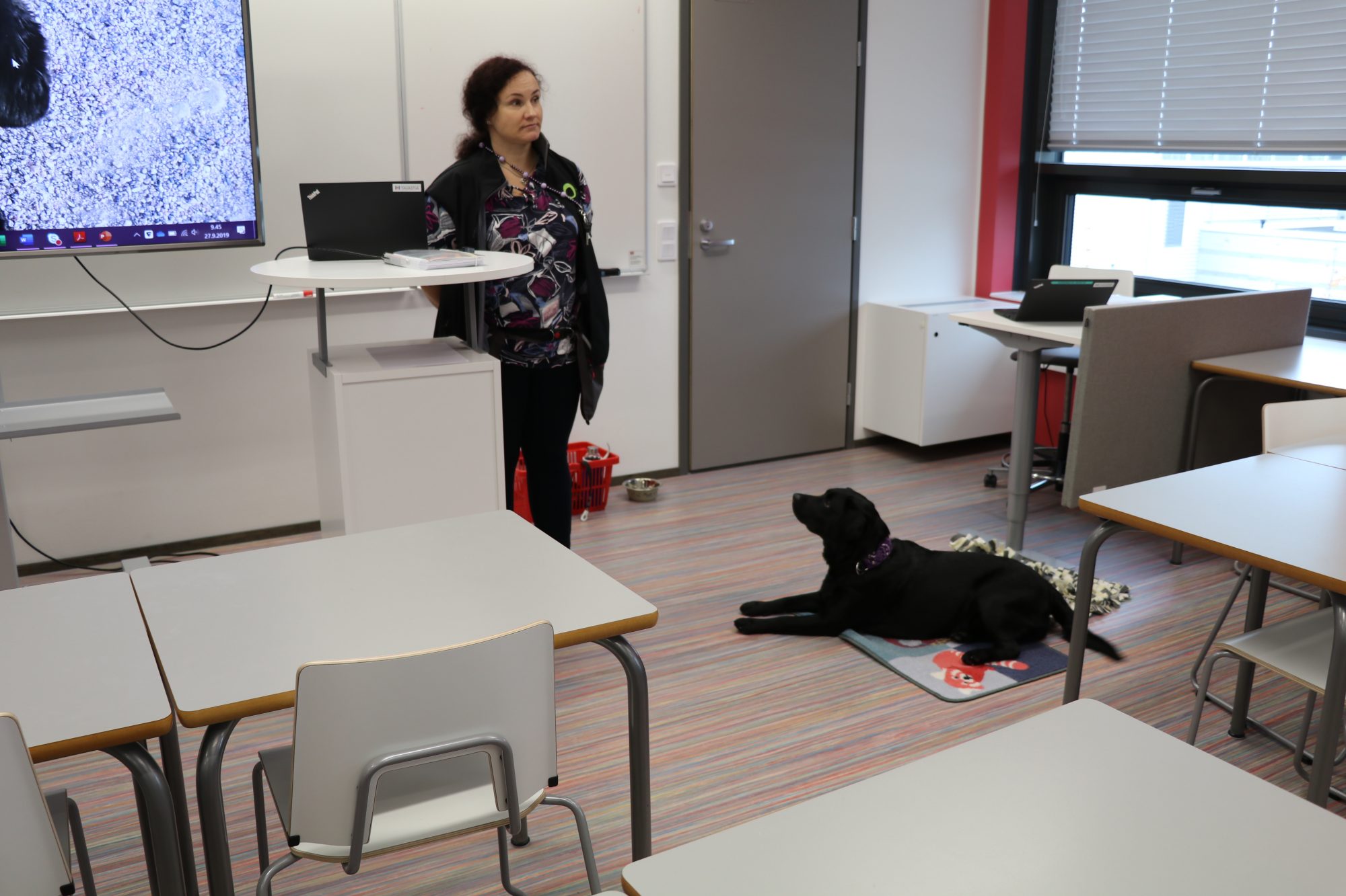 – Ideana on, että voimme Kertun kanssa osallistua opetukseen olemalla läsnä luokassa. Koira voi helpottaa keskittymistä ja jännitystä sekä rauhoittaa luokan ilmapiiriä. Opiskelijoilla voi herätä koiran myötä erilaisia tunnetiloja, mutta positiivisia vaikutuksia on raportoitu paljon, Martikainen sanoo.