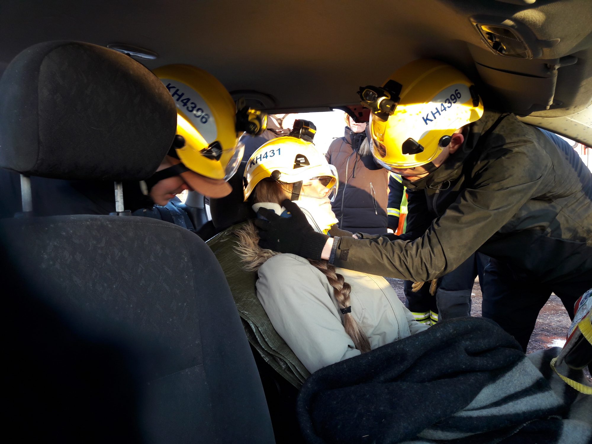 Auto-onnettomuutta simuloivassa liikennepelastamisharjoituksessa opiskelijat treenasivat potilaan irrottamista autosta niin, ettei potilaalle aiheudu enempää vahinkoa, ja samalla harjoiteltiin myös viranomaisten välistä viestimistä VIRVE-verkossa. Osa opiskelijoista esitti potilaita, osa auttajia.