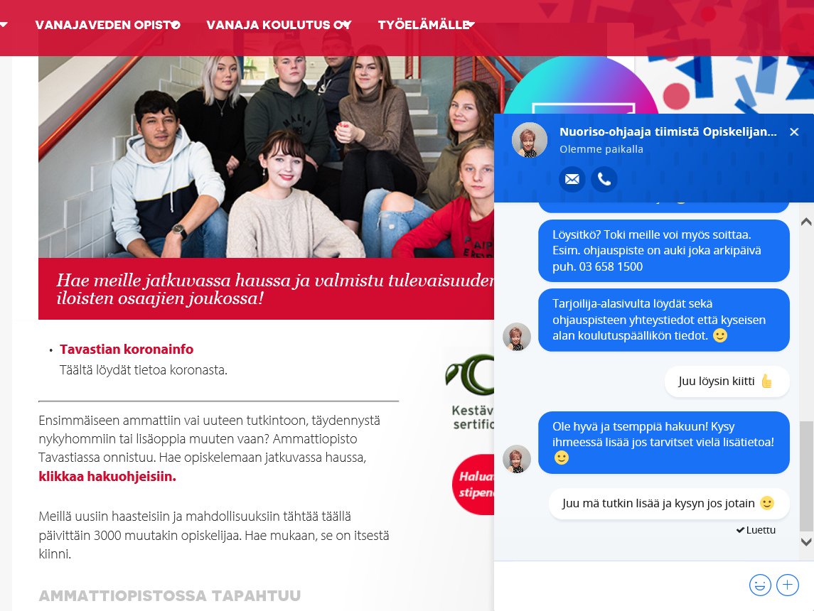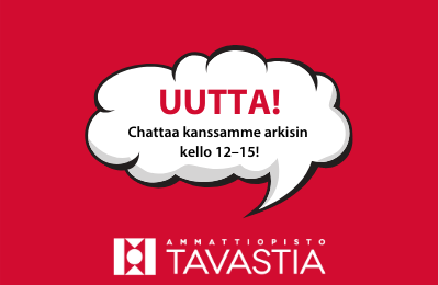Ammattiopisto Tavastian verkkosivuille on avattu chat-palvelu. Chatti toimii maanantaista perjantaihin kello 12–15 ja vastaamassa on opiskelijapalveluiden väkeä: koulukuraattorit, nuoriso-ohjaajat sekä opinto-ohjaajat.