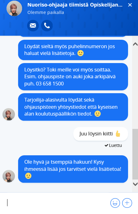 Opiskelijapalveluiden väki toivoo, että heihin oltaisiin rohkeasti yhteydessä, jos tarvitsee apua. Chat on yksi monista kanavista, jonka kautta jeesiä voi kysyä.