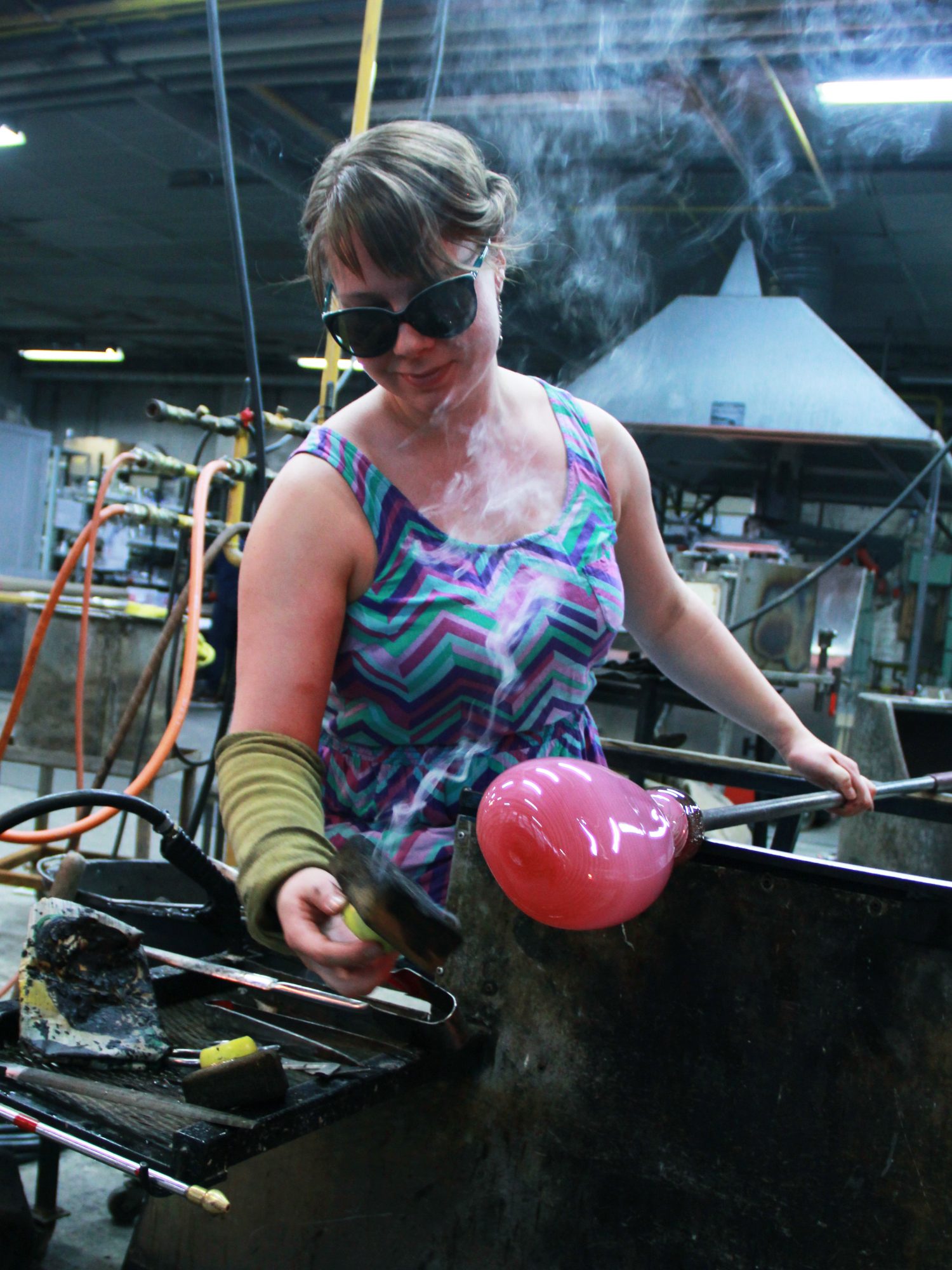 Lasihyteissä, joissa lasia puhalletaan ja työstetään, lämpötila nousee etenkin kesähelteellä kuumaksi. Paula Pääkkösen mielestä lasinpuhalluksen fyysisyys on osa tekemisen viehätystä.
