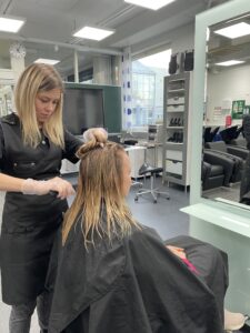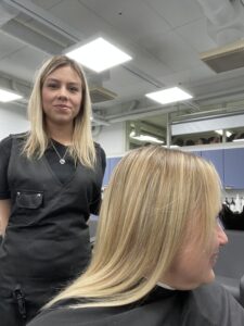 Nataliia Levchenko opiskelee ryhmässä ja teki Tavastian monikulttuurisuuskoordinaattori Tiina Alhaisen hiuksille pesun, hoidon ja kampauksen ja leikkasi vielä latvatkin kuntoon. Ryhmä oli harjoitellut leikkaamista harjoituspäälle kahdesti, hyvää jälkeä tuli ammatillisen ohjaajan ohjauksessa myös Tiinan pään kanssa. Nataliia on kotoisin Ukrainasta ja on jo siellä toiminut parturina. Hän pitää koulutuksesta, opettajista ja ryhmä on hänen mielestään kiva. Nyt päästään jo tekemään työtä oikeiden asiakkaiden kanssa. Nataliia haluaa tehdä jatkossa työtä Suomessa parturi-kampaajana.