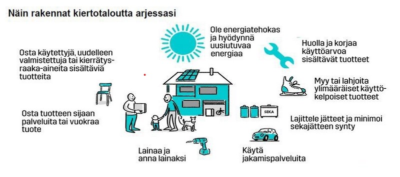 Keräsin seuraavaan kuvaan muutamia asioita, joiden avulla voit itse vaikuttaa kiertotalouden toteutumiseen.