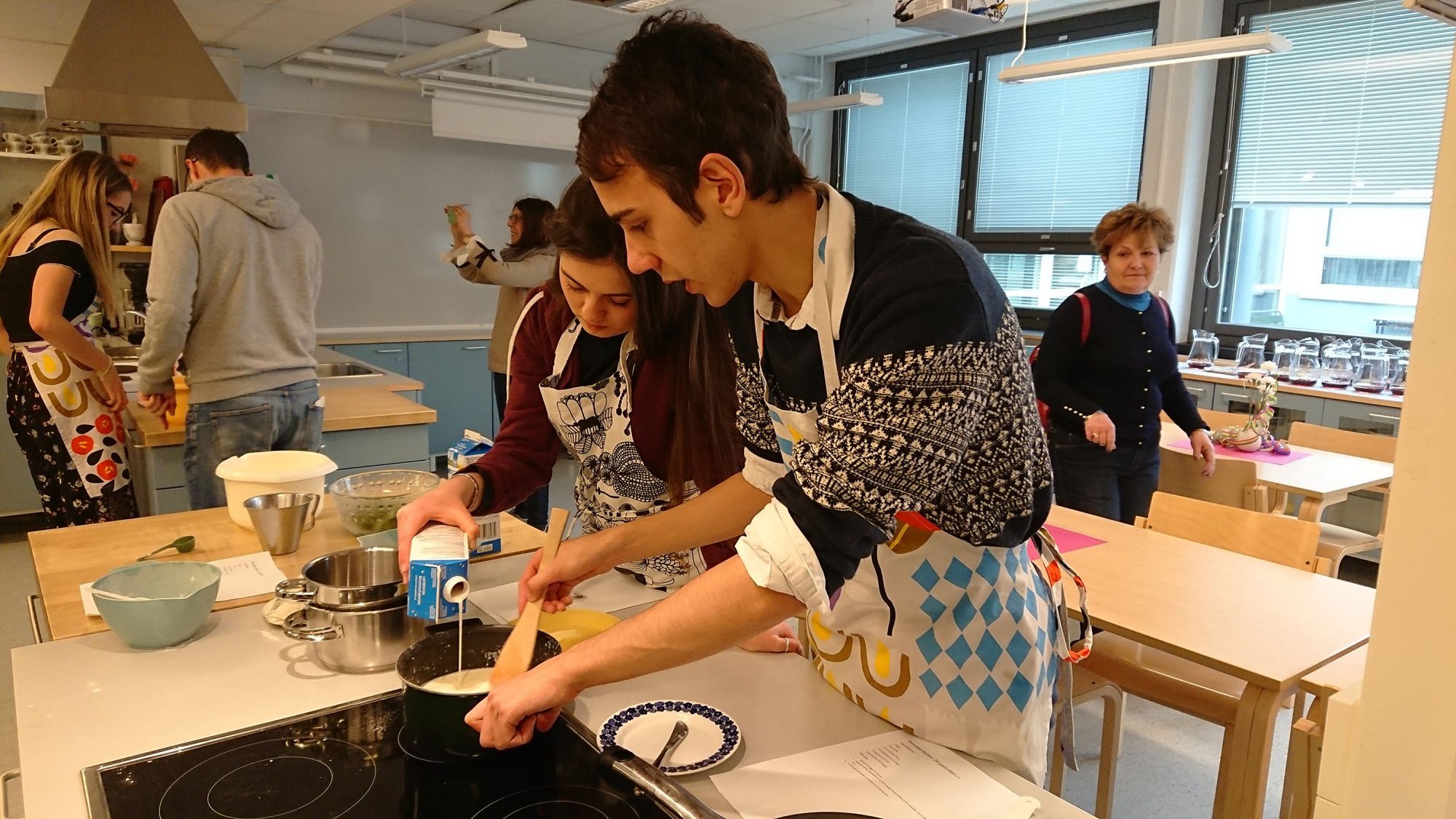 Torstaina järjestettiin päivällinen, jolloin valmistettiin ja syötiin suomalaisia ruokia. Tarjolla oli pinaattikeittoa, perunarieskoja, mustikkapiirakkaa sekä lettuja. Jokaisessa ryhmässä oli noin neljä jäsentä eri maista ja heidän lisäkseen jokaista keittiötä kohden yksi suomalainen opastamassa ruokien teossa.
