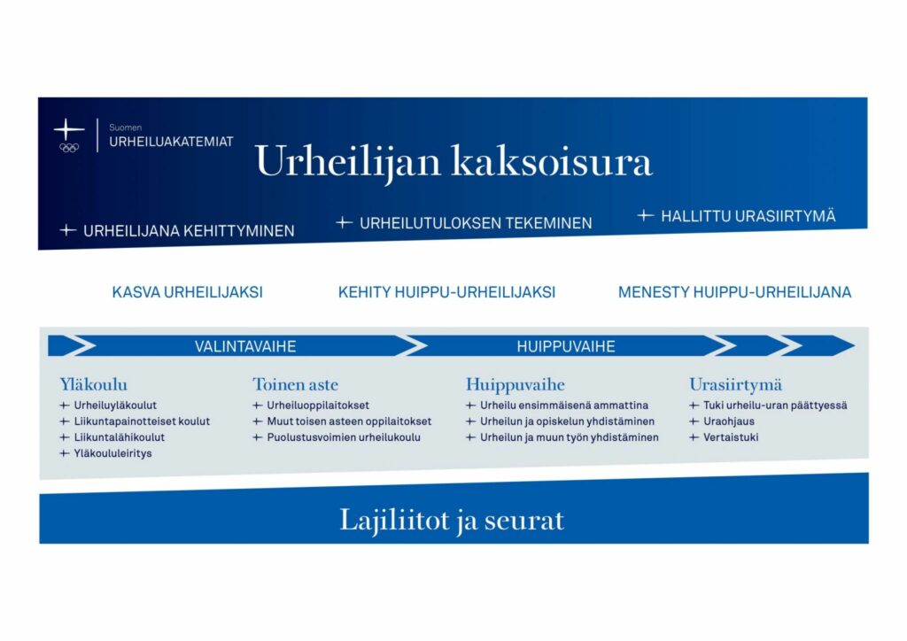 Urheiluakatemioiden ja valmennuskeskusten laadukasta toimintaa ohjaa ja yhteisiä toimintatapoja varmistaa yhteinen Suomen Olympiakomiten laatima ohjeisto ja kriteeristö. Olympiakomitea tukee ja sparraa urheiluakatemioiden toiminnan kehittämistä. avoitteena on urheilijoiden ja valmentajien kehittyminen, paremman urheilumenestyksen tuottaminen sekä suunnitelmallisen kaksoisuran mahdollistaminen urheilijoille.