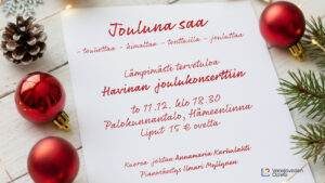 Tervetuloa Havinan joulukonserttiin Jouluna saa! Torstaina 11.12. klo 18.30 Palokunnantalolla. Kuoroa johtaa Annamaria Karhulahti, säestys Ilmari Myllynen. Liput ovelta 15 […]